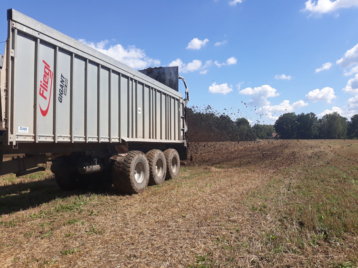Pro rozmetání a dopravu hnoje, kompostů a dalších organických materiálů využíváme velkoobjemové rozmetadlo Fliegl, které je vybaveno širokými pneumatikami pro minimalizaci tlaku na půdu a šetrný pohyb po pozemku.
